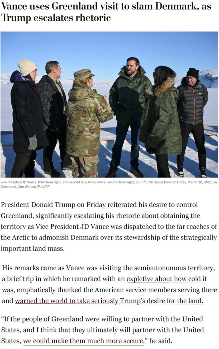 當(dāng)?shù)貢r(shí)間28日,美國(guó)副總統(tǒng)萬(wàn)斯率代表團(tuán)“到訪”丹麥自治領(lǐng)地格陵蘭島上的美軍基地。