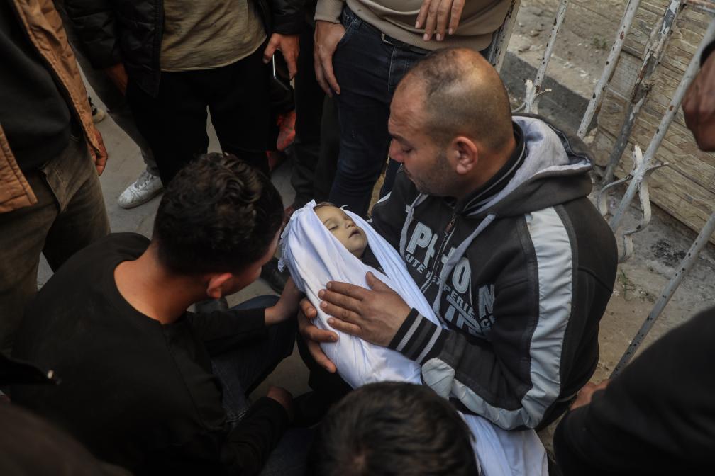 3月18日,在加沙地帶北部加沙城的一所醫(yī)院內(nèi),人們哀悼以軍空襲的遇難者。新華社發(fā)(里澤克·阿卜杜勒賈瓦德攝)