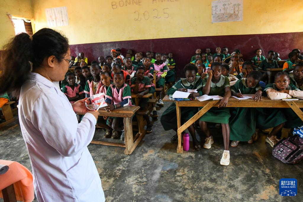 4月3日,在喀麥隆姆巴爾馬約的一所小學(xué),中國(guó)(山西)第24批援喀麥隆醫(yī)療隊(duì)姆巴爾馬約分隊(duì)的醫(yī)生教授學(xué)生預(yù)防傳染病的方法。新華社發(fā)(科普索攝)