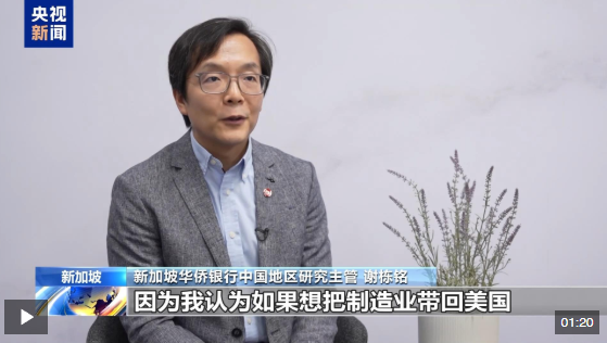 新加坡華僑銀行中國地區(qū)研究主管 謝棟銘:即使新加坡對美不存在貿(mào)易順差,也沒有對美國施加關(guān)稅,還是被征收10%的關(guān)稅。