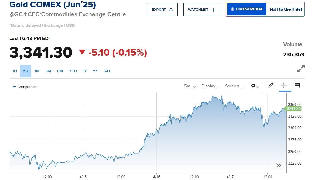 近期受美關(guān)稅政策影響,市場(chǎng)恐慌情緒蔓延,投資者投資策略偏向避險(xiǎn),進(jìn)而拉升國際金價(jià)的走高。美東時(shí)間4月18日,美國紐約商品交易所6月黃金期貨價(jià)格收于每盎司3341.30美元,較前一日小幅下跌,但仍處于高位。