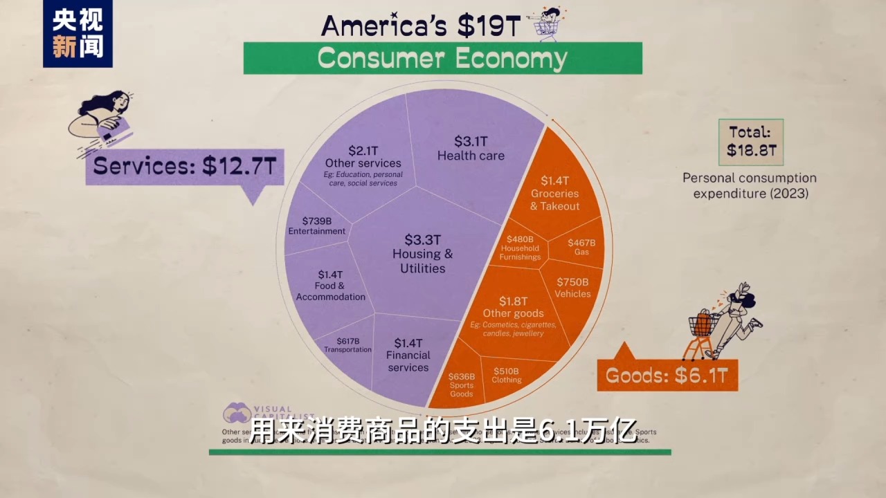 按美國(guó)勞動(dòng)局?jǐn)?shù)據(jù),美國(guó)人2023年消費(fèi)支出18.8萬(wàn)億美元,其中12.7萬(wàn)億花在了看病、租房、交學(xué)費(fèi)、打官司等服務(wù)上,用來(lái)消費(fèi)商品的支出是6.1萬(wàn)億,不到總消費(fèi)的三分之一。所以吹噓美國(guó)消費(fèi)能力強(qiáng)屬實(shí)是個(gè)“地獄笑話(huà)”,看病花錢(qián)多有什么可驕傲的?