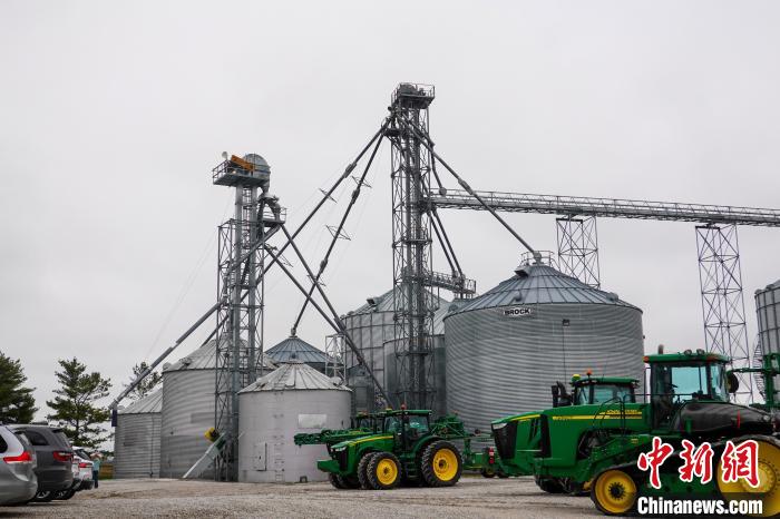當(dāng)?shù)貢r(shí)間4月25日,在美國(guó)艾奧瓦州首府得梅因市郊的金伯利農(nóng)場(chǎng),多輛拖拉機(jī)停在谷倉(cāng)附近?!≈行律缬浾?王帆 攝