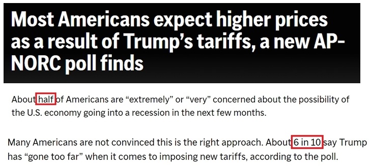 對(duì)于特朗普政府的關(guān)稅政策,近六成的受訪者認(rèn)為政府“做得太過(guò)了”。另外,約有一半受訪者“極度”或“非常”擔(dān)心美國(guó)經(jīng)濟(jì)會(huì)在未來(lái)幾個(gè)月陷入衰退。
