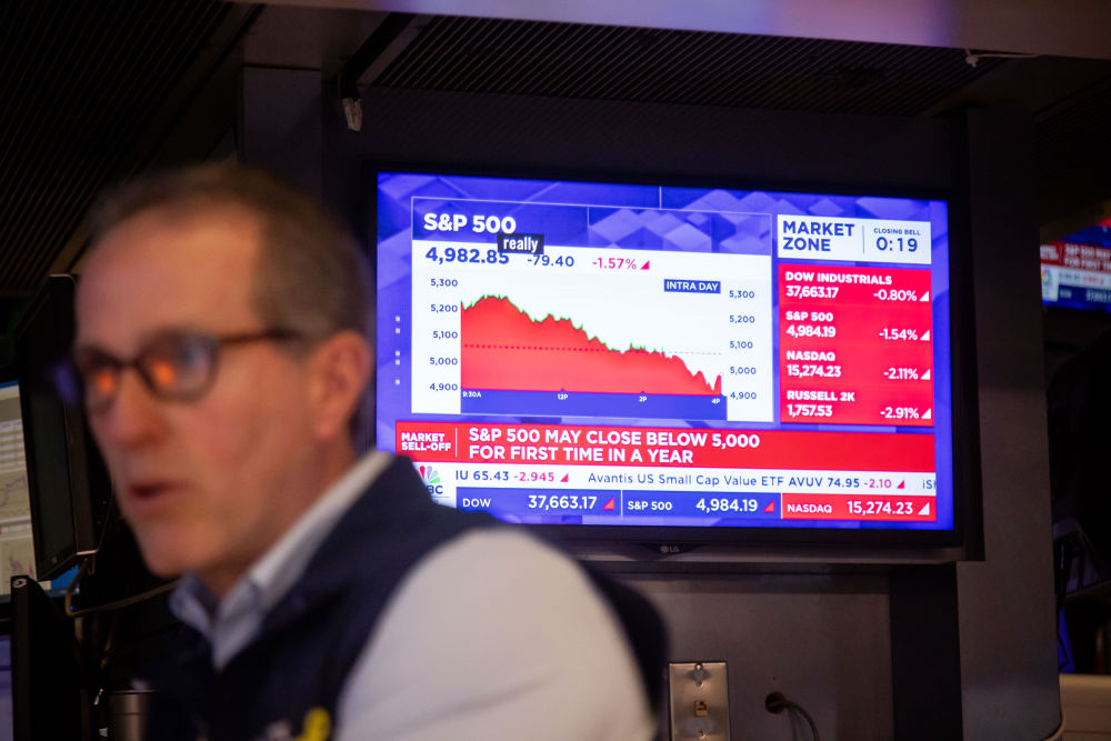 4月8日,交易員在美國紐約證券交易所交易大廳工作。紐約股市三大股指當(dāng)天下跌。新華社發(fā)(郭克攝)