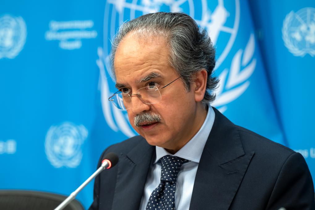 5月2日,在位于紐約的聯(lián)合國總部,巴基斯坦常駐聯(lián)合國代表阿西姆·伊夫蒂哈爾·艾哈邁德在新聞發(fā)布會(huì)上講話。新華社發(fā)(聯(lián)合國供圖/馬克·加滕攝)