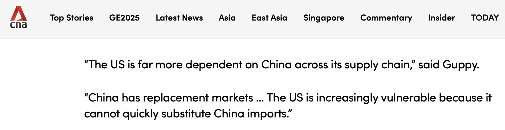 報(bào)道稱,澳大利亞金融專欄作家戴若·顧比表示,“美國整個(gè)供應(yīng)鏈對(duì)中國的依賴程度要高得多”,“中國有替代市場……美國則越來越脆弱,因?yàn)樗鼰o法迅速找到中國進(jìn)口產(chǎn)品的替代品”。