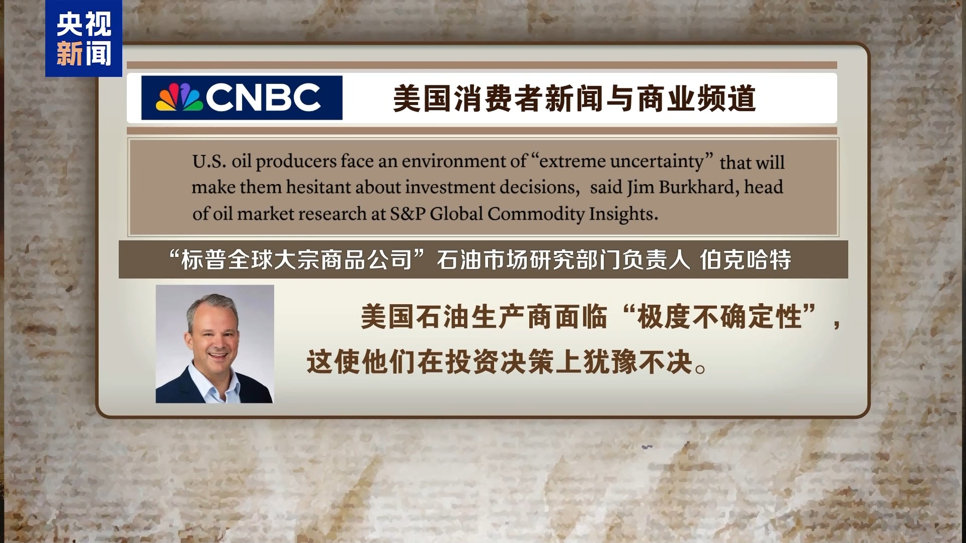 美國(guó)消費(fèi)者新聞與商業(yè)頻道援引“標(biāo)普全球大宗商品公司”石油市場(chǎng)研究部門負(fù)責(zé)人伯克哈特的話報(bào)道稱,美國(guó)石油生產(chǎn)商面臨“極度不確定性”,這使他們?cè)谕顿Y決策上猶豫不決。