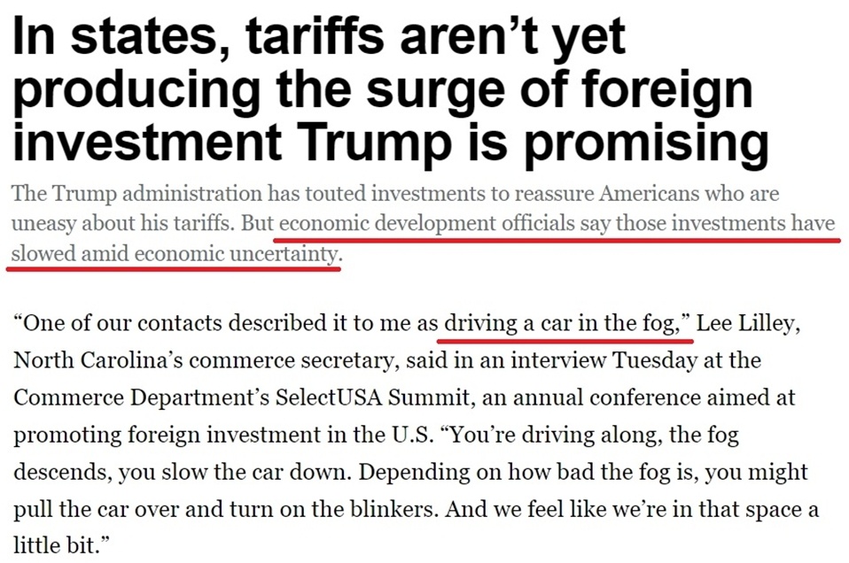 美國政府一直宣稱,加征關稅將為美國吸引數(shù)萬億美元的外國投資。但據(jù)美國《政治報》報道,來自美國多個州的政府官員和議員都抱怨說,白宮關稅政策引發(fā)的不確定性正在阻礙外資進入美國市場。