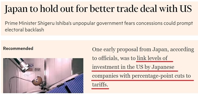 另據(jù)報道,考慮到日本是美國最大海外投資來源國,日方除考慮進一步對美開放市場等讓步條件外,早期談判方案中還包括將美國對日商品關稅減免的百分點與日本企業(yè)在美投資水平掛鉤。