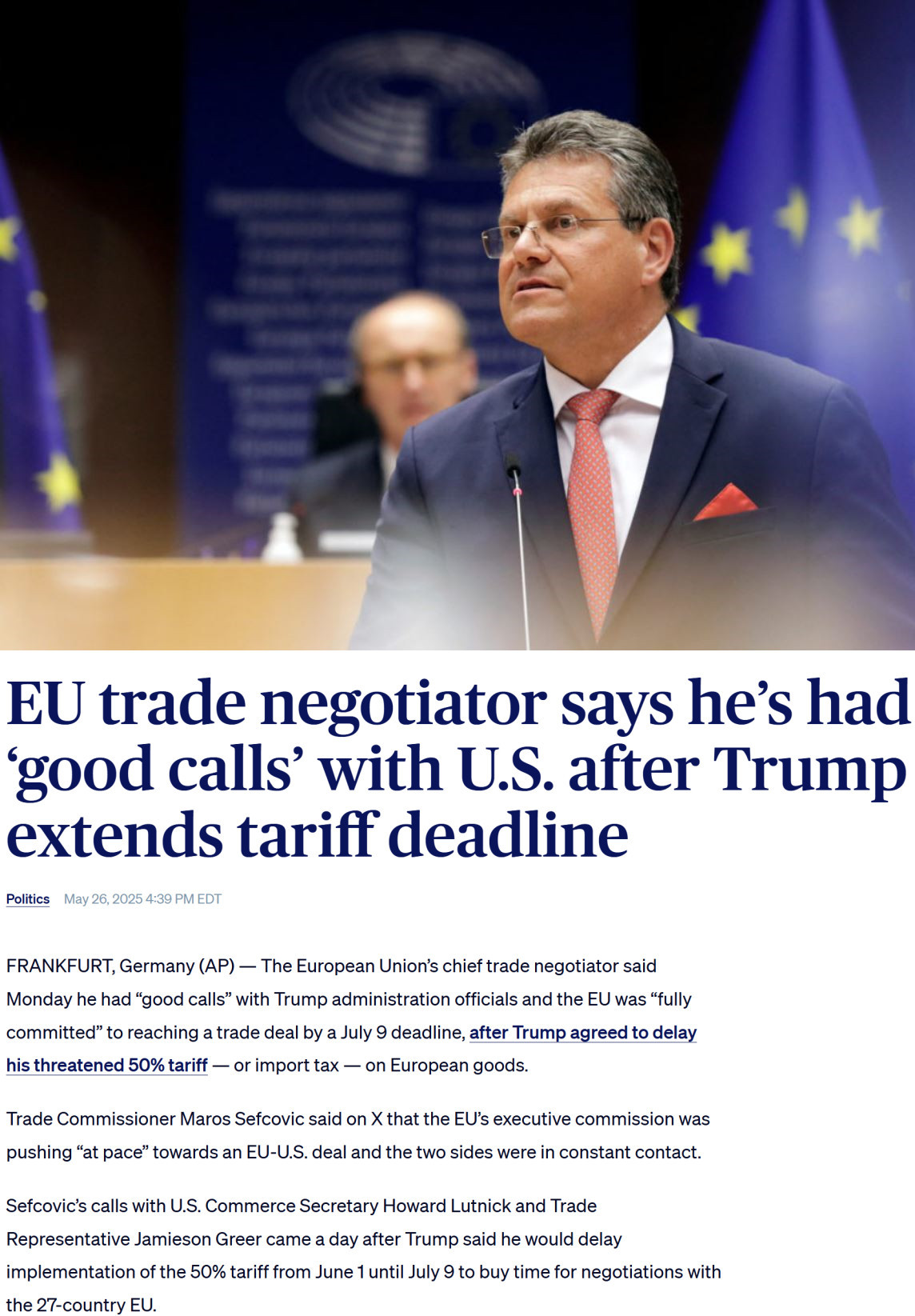 當(dāng)?shù)貢r間26日,歐盟貿(mào)易委員謝夫喬維奇與美方代表通話后表示,歐盟完全致力于在7月9日前與美方達(dá)成一項協(xié)議。