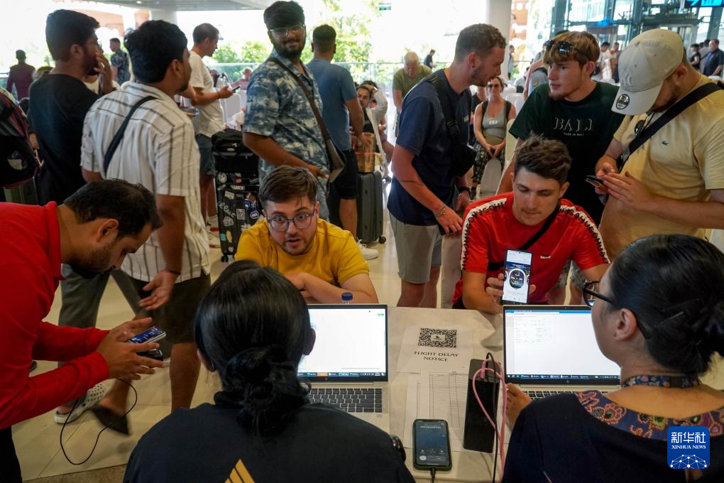 6月18日,在印度尼西亞巴厘島伍拉萊國(guó)際機(jī)場(chǎng),由于勒沃托比-拉基拉基火山噴發(fā)導(dǎo)致航班延誤的乘客們?cè)儐栃畔?。新華社發(fā)(比辛拉西攝)