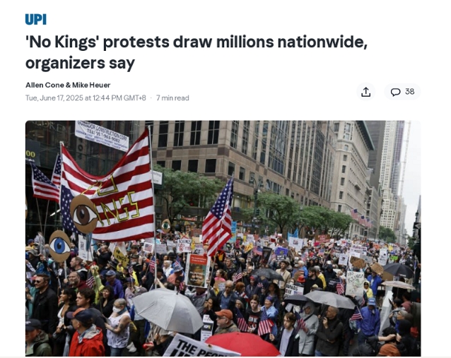 據(jù)美國合眾國際社(UPI)6月17日報道,上個周末,全美多地爆發(fā)約2000場名為“不要國王”(No Kings)的抗議活動,組織者稱參與人數(shù)達數(shù)百萬。