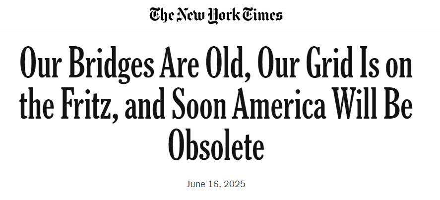 《紐約時報》6月16日刊發(fā)專欄文章稱,美國的橋梁、電網(wǎng)和港口等基礎設施正面臨嚴重的老化與不足,美國即將被“老化淘汰”。