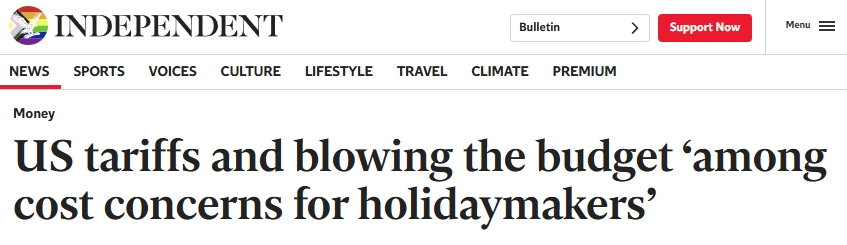 此外,美國關(guān)稅政策的影響已外溢至國際層面,甚至影響了外國民眾的出行計(jì)劃。英國《獨(dú)立報(bào)》援引的一項(xiàng)報(bào)告顯示,78%的受訪者擔(dān)心美國貿(mào)易關(guān)稅可能對國外目的地的價(jià)格造成影響;53%的人計(jì)劃避開那些他們認(rèn)為關(guān)稅可能會推高國外目的地的物價(jià);77%的人表示,匯率是他們的一大擔(dān)憂。