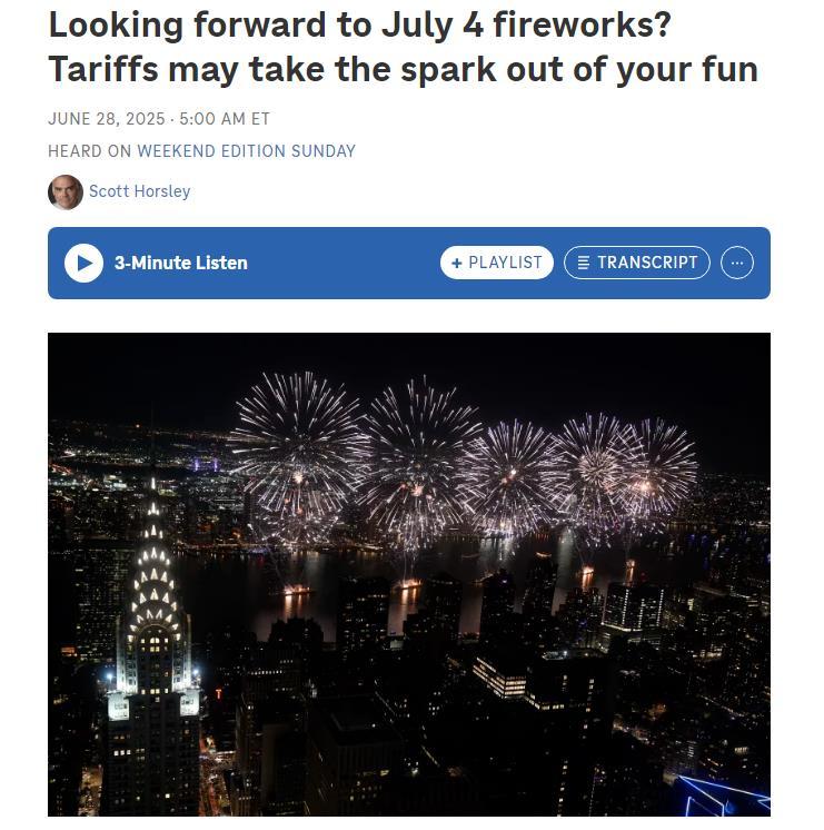美國全國公共廣播電臺網(wǎng)站近日發(fā)表一篇文章說,美國人即將迎來獨立日慶典,燒烤派對、節(jié)日游行和煙花表演自然是重頭戲。但受特朗普政府加征關稅影響,今年煙花價格可能飆升,供應也將更加緊俏。這是因為,美國用于慶祝獨立日的火箭煙花、手持電光花和噴泉禮花,幾乎完全依賴中國供應——而早在一千多年前,正是中國人發(fā)明了煙花。