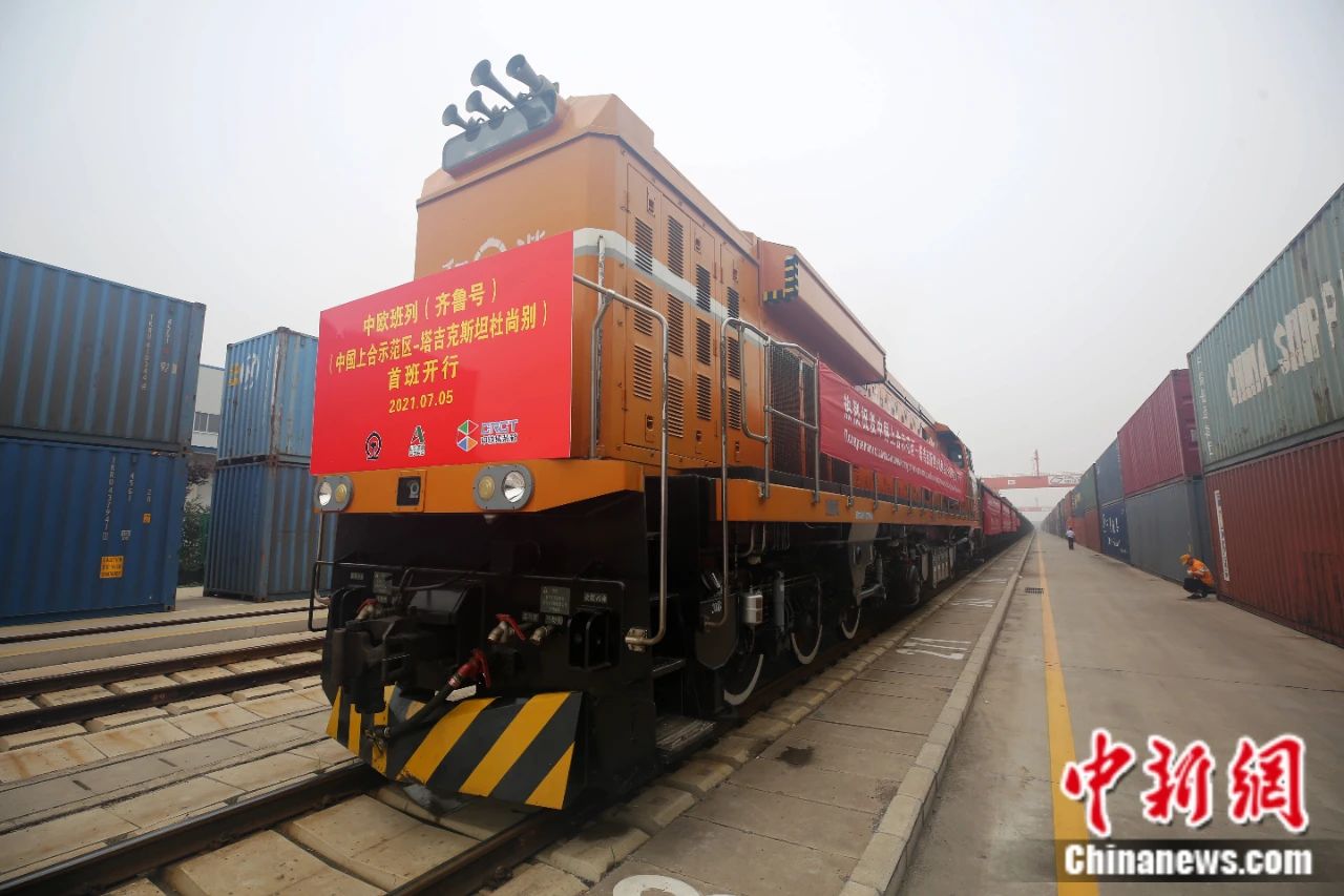 2021年7月5日, 中國(guó)—上海合作組織地方經(jīng)貿(mào)合作示范區(qū)(簡(jiǎn)稱(chēng)“上合示范區(qū)”)前往塔吉克斯坦首都杜尚別的首班中歐班列(齊魯號(hào))“上合快線”發(fā)出,從上合示范區(qū)青島多式聯(lián)運(yùn)中心啟程。中新社記者 胡耀杰 攝