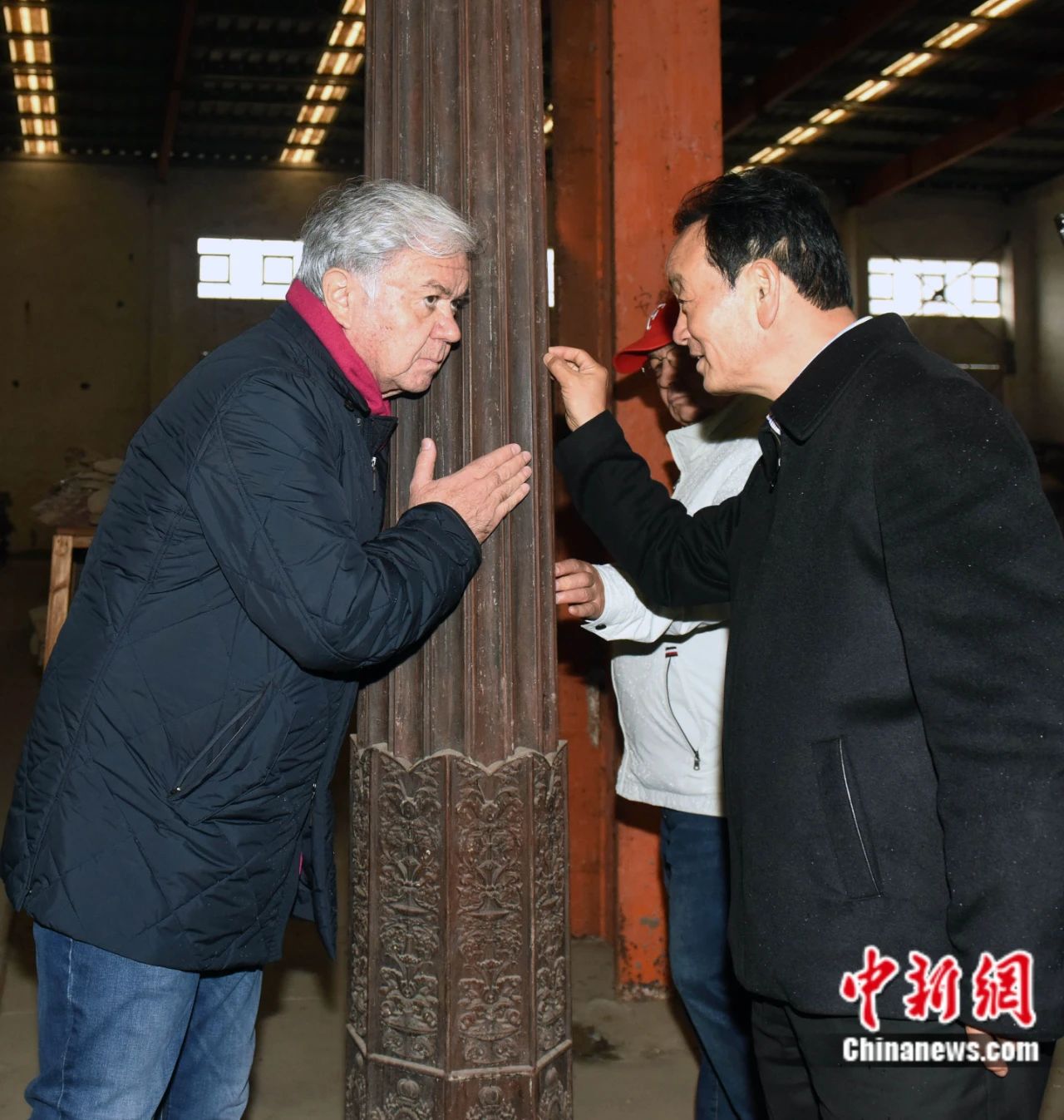 2018年11月7日,拉希德·阿利莫夫(左一)作為時(shí)任上合組織秘書(shū)長(zhǎng),來(lái)到安徽蚌埠“湖上升明月”中華古民居博覽園參觀考察。圖為拉希德·阿利莫夫在細(xì)細(xì)傾聽(tīng)來(lái)自敲打老木頭的聲音。中新社發(fā) 鐘欣 攝