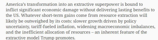 文章認(rèn)為,美國向資源掠奪型超級大國的蛻變,注定將無法為美國帶來持久利益,反而還會給美國自身造成重大經(jīng)濟損害。資源掠奪帶來的任何短期收益,都可能被以下代價抵消:政策不確定性導(dǎo)致的增長放緩、關(guān)稅推高的通貨膨脹、日益擴大的宏觀經(jīng)濟失衡,以及資源配置的低效——這些正是掠奪模式與生俱來的缺陷。