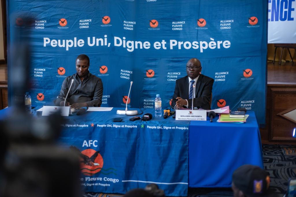 7月3日,剛果(金)反政府武裝“M23運動”對話代表姆博寧帕(右)出席在戈馬舉行的記者會。新華社發(fā)(扎內(nèi)姆·內(nèi)蒂·扎伊迪攝)
