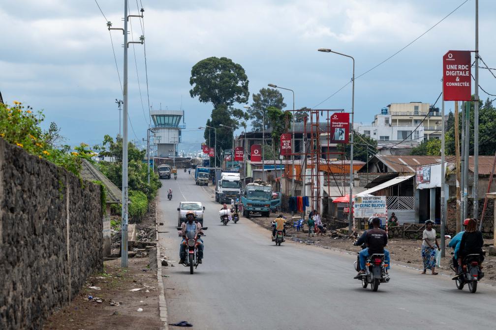 這是5月5日在剛果(金)東部北基伍省戈馬市拍攝的市中心街道和遠處的機場塔臺。新華社記者鄭揚子攝