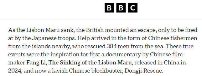 文章說(shuō),在這艘載有英軍戰(zhàn)俘的船只“里斯本丸”號(hào)沉沒過(guò)程中,英國(guó)戰(zhàn)俘組織突圍逃生,卻遭到日軍掃射。附近島嶼的中國(guó)漁民們伸出了援手,從海中救起384人。這一真實(shí)事件先后催生了兩部影視作品:紀(jì)錄片《里斯本丸沉沒》,以及電影《東極島》。