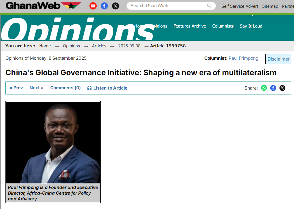加納新聞網(wǎng)站“Ghana Web”9月8日刊發(fā)加納非中政策咨詢中心執(zhí)行主任保羅·弗林蓬的署名文章《中國全球治理倡議:塑造多邊主義新時(shí)代》,對(duì)中國提出的全球治理倡議予以高度評(píng)價(jià)。