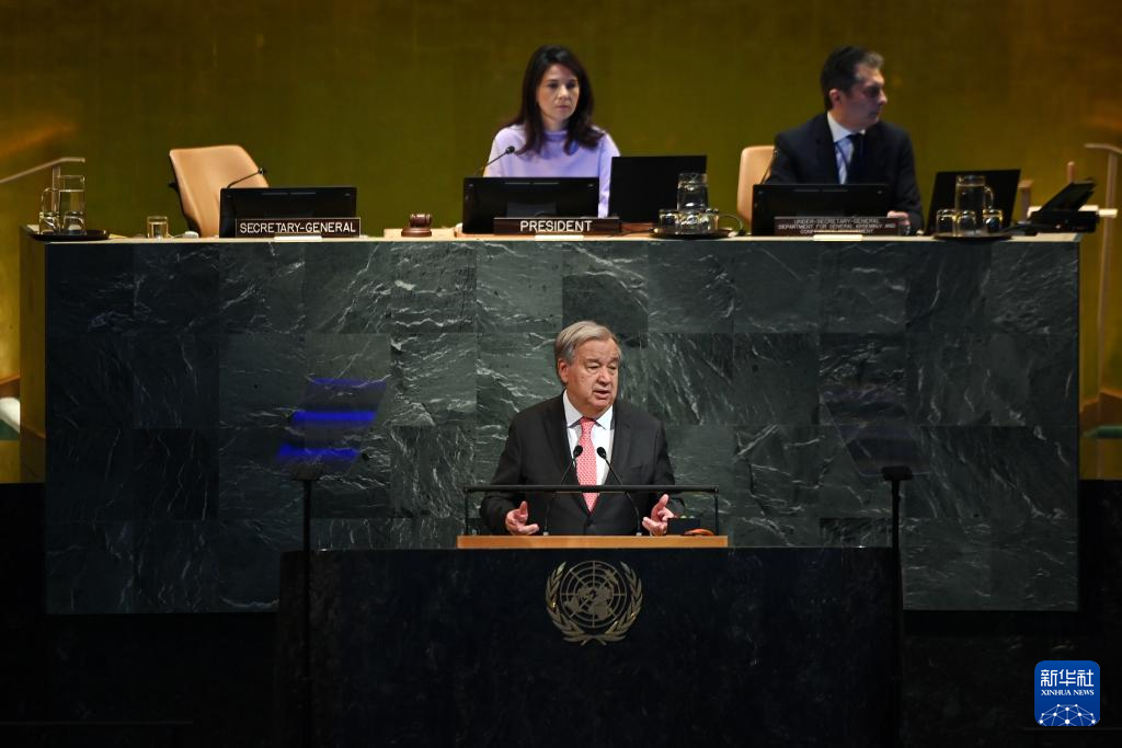 9月22日,在位于紐約的聯(lián)合國總部,聯(lián)合國秘書長安東尼奧·古特雷斯(前)在紀念聯(lián)合國成立80周年高級別會議上講話。新華社記者 李睿 攝