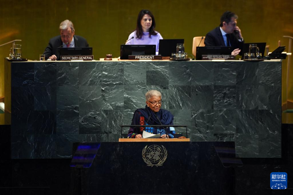 9月22日,在位于紐約的聯(lián)合國總部,第80屆聯(lián)合國大會主席安娜萊娜·貝爾伯克(前)在紀念聯(lián)合國成立80周年高級別會議上講話。新華社記者 李睿 攝