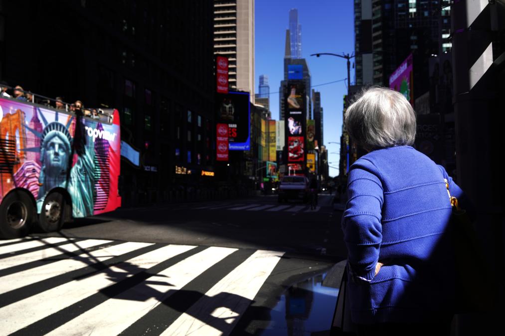 10月1日,在美國(guó)紐約曼哈頓的時(shí)報(bào)廣場(chǎng)附近,行人等待通過(guò)人行橫道斑馬線(xiàn)過(guò)馬路。新華社記者 吳曉凌 攝