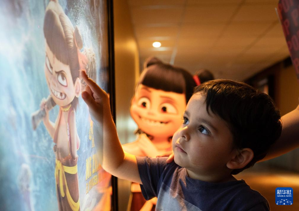 10月2日,一名男孩在阿根廷首都布宜諾斯艾利斯的一家電影院觀看《哪吒2》海報。新華社發(fā)(馬丁·薩巴拉攝)