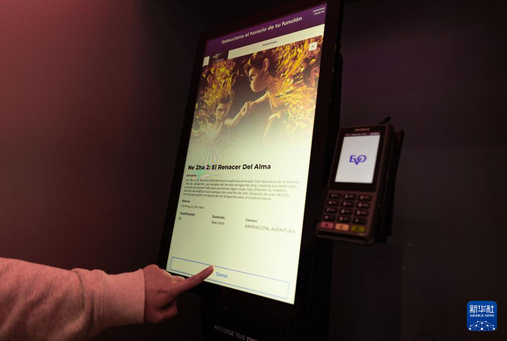 9月25日,在墨西哥首都墨西哥城的一家電影院,觀眾在自動售票機(jī)上購買《哪吒2》電影票。新華社記者 李夢馨 攝