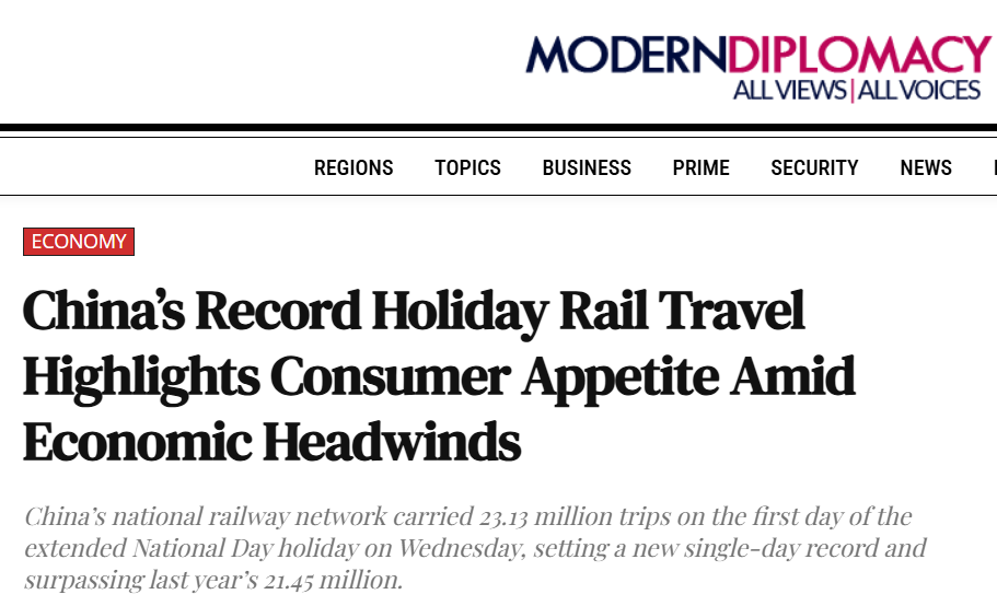 歐洲《現(xiàn)代外交》(Modern Diplomacy)網(wǎng)站報(bào)道注意到,中國(guó)國(guó)慶中秋“超長(zhǎng)黃金周”首日,全國(guó)鐵路發(fā)送旅客2313萬(wàn)人次,創(chuàng)下單日歷史新高。報(bào)道援引官方預(yù)測(cè)稱(chēng),整個(gè)八天假期出行總量預(yù)計(jì)將達(dá)23.6億人次,日均出行近3億人,堪稱(chēng)“史上最忙假期”。