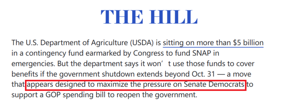 對此,美國《國會山報(bào)》直言,農(nóng)業(yè)部種種說辭顯然為了最大限度地向參議院民主黨人施壓,迫使他們支持共和黨的支出法案,以重啟政府。