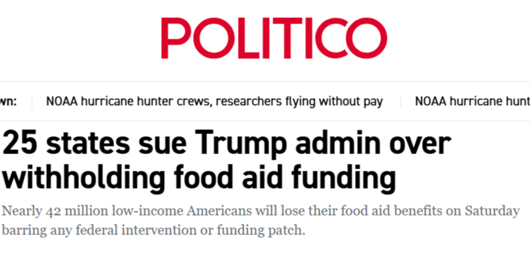 據(jù)美國《政治報(bào)》網(wǎng)站報(bào)道,受政府持續(xù)“停擺”影響,美農(nóng)業(yè)部宣布暫停其“補(bǔ)充營養(yǎng)援助計(jì)劃”(SNAP),11月1日起停止發(fā)放食品救濟(jì)。目前這一項(xiàng)目覆蓋約4200萬人,約占美國總?cè)丝诎朔种?,其中多?shù)為低收入群體和殘障人士。SNAP項(xiàng)目暫停后,他們的生活將難以為繼。當(dāng)?shù)貢r間28日,民主黨主政的25個州和首都華盛頓對聯(lián)邦政府提起訴訟,要求動用聯(lián)邦應(yīng)急資金,以維持這一項(xiàng)目。