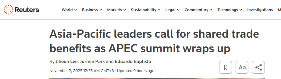 2025年亞太經(jīng)合組織(APEC)領導人非正式會議于10月31日至11月1日在韓國慶州舉行,會議發(fā)表了《慶州宣言》。多家外媒報道稱,會議凸顯了亞太地區(qū)經(jīng)濟體對自由貿(mào)易的承諾。