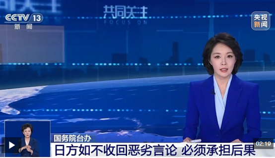 日本在臺(tái)灣問題上對中國人民負(fù)有歷史罪責(zé)。甲午戰(zhàn)爭后,日本強(qiáng)行侵占臺(tái)灣并進(jìn)行長達(dá)半個(gè)世紀(jì)的殖民統(tǒng)治。日據(jù)時(shí)期,臺(tái)灣人民災(zāi)難深重,數(shù)十萬同胞被殺害,民眾淪為“亡國奴”、毫無政治權(quán)利、信仰自由和文化自由,寶島的礦產(chǎn)資源、民生物資遭瘋狂掠奪。日本侵略者在臺(tái)灣犯下的罪行罄竹難書,是臺(tái)灣歷史最黑暗的一頁。包括臺(tái)灣同胞在內(nèi)的全體中國軍民浴血奮戰(zhàn),打敗了日本軍國主義侵略者,贏得抗日戰(zhàn)爭偉大勝利,光復(fù)臺(tái)灣。在抗戰(zhàn)勝利、臺(tái)灣光復(fù)80周年之際,日方不是反省罪惡歷史、吸取慘痛教訓(xùn),其首相高市早苗反而拋出涉臺(tái)露骨言論且態(tài)度惡劣,妄圖介入臺(tái)海局勢、否定抗戰(zhàn)勝利成果、挑戰(zhàn)戰(zhàn)后國際秩序。對此,中國政府、中國人民決不答應(yīng)、決不容忍、決不姑息。日方如不立即糾正錯(cuò)誤,收回惡劣言論,必須承擔(dān)由此引發(fā)的一切后果。如其膽敢武力介入臺(tái)灣問題,我們必將予以迎頭痛擊、堅(jiān)決粉碎。