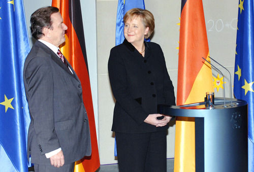 2005年11月22日,在德國(guó)首都柏林,德國(guó)新總理默克爾(右)與卸任的前總理施羅德(左)在總理府舉行交接儀式。(吳曉凌攝)