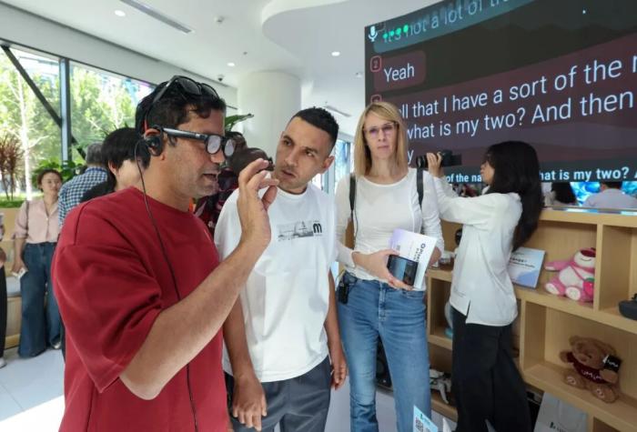 2025年9月29日,在“外國記者走進(jìn)北京”——經(jīng)開區(qū)專題推介活動(dòng)上,外國記者佩戴自動(dòng)翻譯眼鏡。中新社記者 賈天勇 攝
