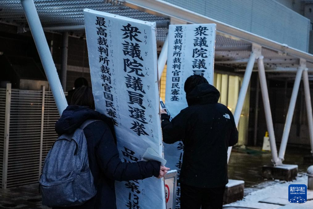 2月8日,在日本東京,工作人員在一處投票站外放置投票站標(biāo)志。新華社記者 賈浩成 攝