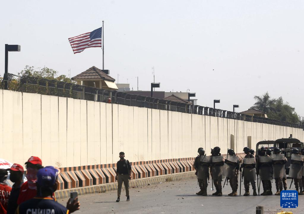 3月1日,執(zhí)法人員(畫面右側(cè))在巴基斯坦南部城市卡拉奇的美國駐卡拉奇領(lǐng)事館外控制局勢。新華社發(fā)(伊姆蘭·阿里攝)