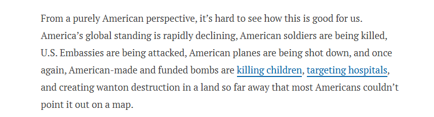 文章作者稱,(美國)這場“無緣無故且非法的軍事行為”已將地區(qū)拖入暴力升級的漩渦,導(dǎo)致數(shù)百名無辜平民喪生。即便從美國自身利益視角看,此舉亦難言獲益——美國全球地位正迅速下降,美軍士兵不斷傷亡,使館與飛機遭襲,而美國制造或資助的炸彈仍在遙遠土地上造成平民死傷與基礎(chǔ)設(shè)施破壞。