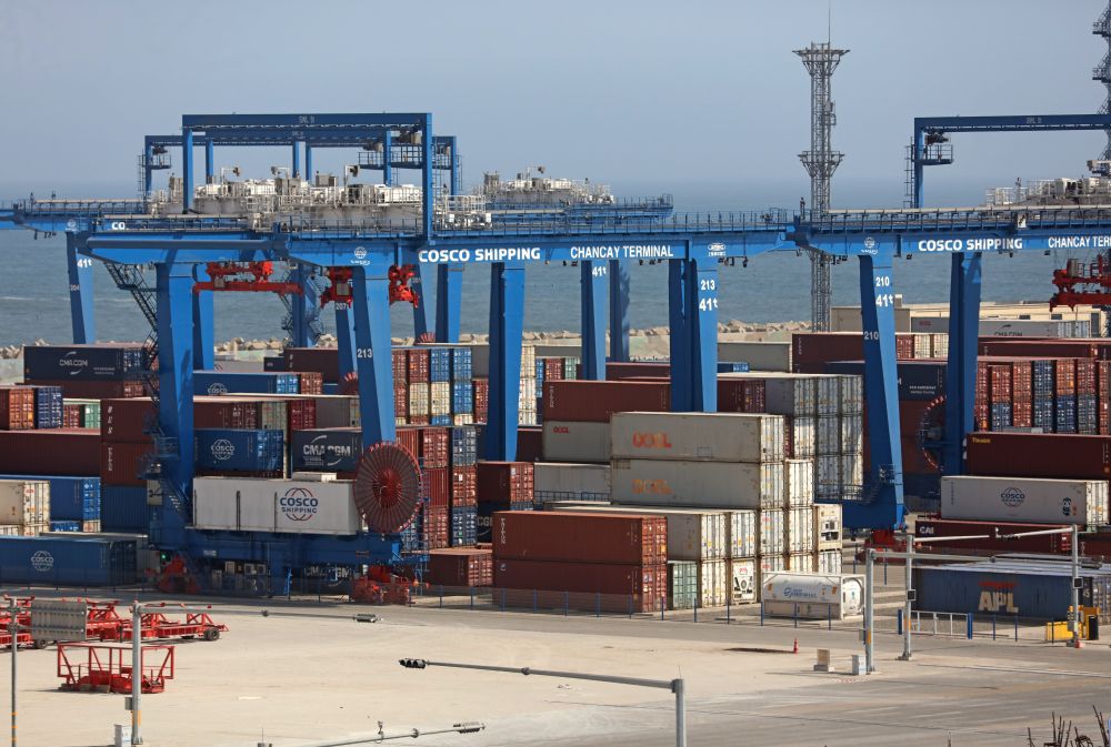 這是2025年10月7日拍攝的秘魯錢凱港碼頭擺放的集裝箱。位于秘魯首都利馬以北約80公里的錢凱港于2024年11月正式開港,標(biāo)志著中秘共建“一帶一路”取得新的重要成果。新華社發(fā)(瑪麗安娜·巴索攝)
