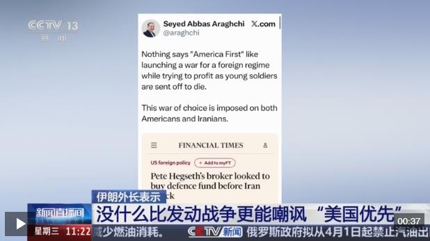 對于美國國防部長赫格塞思的投資經(jīng)紀(jì)人曾在美以對伊朗發(fā)起軍事打擊前,嘗試投資防務(wù)類基金一事,伊朗外交部長阿拉格齊3月31日在社交媒體發(fā)文說,沒有什么比為一個外國政權(quán)發(fā)動戰(zhàn)爭、并從被派往前線的年輕士兵之死中牟取暴利,更能嘲諷“美國優(yōu)先”口號的了。