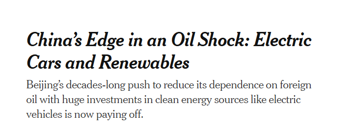 面對(duì)中東戰(zhàn)事外溢沖擊全球能源市場(chǎng)這一議題,《紐約時(shí)報(bào)》近日?qǐng)?bào)道指出,在全球主要工業(yè)國(guó)紛紛陷入能源焦慮之際,中國(guó)通過數(shù)十年來大力投資電動(dòng)汽車和可再生能源,構(gòu)建起真正意義上的能源抗壓屏障