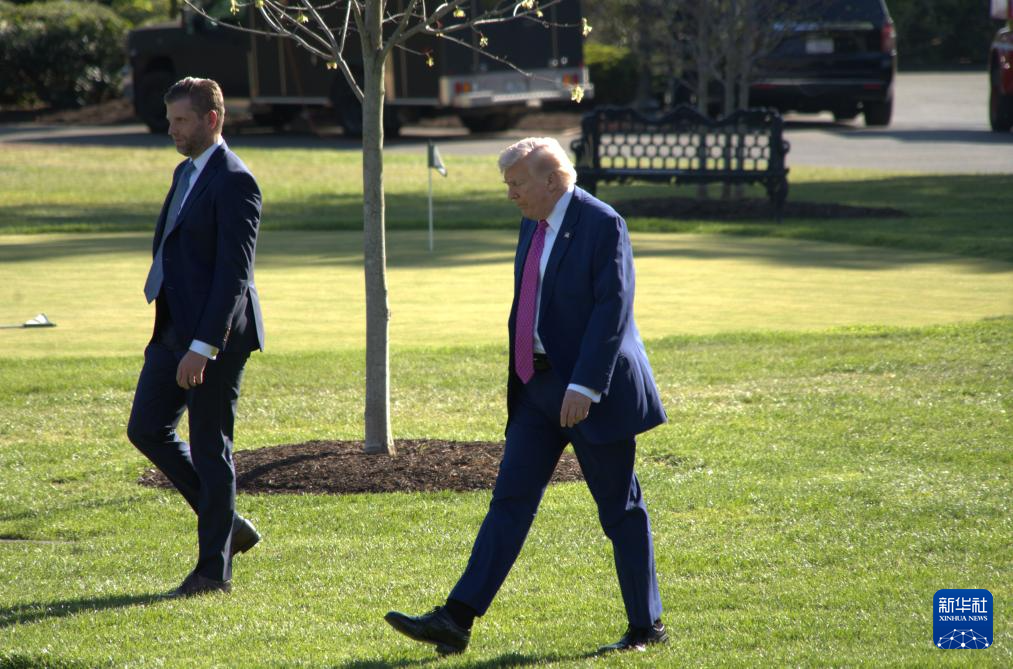 4月10日,美國總統(tǒng)特朗普(右)準(zhǔn)備乘直升機(jī)離開華盛頓白宮。新華社發(fā)(李源清攝)