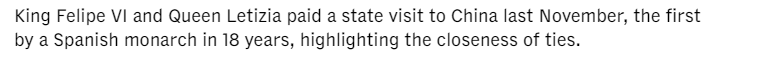 西班牙首相桑切斯4月11日至15日對中國進行正式訪問。此訪是桑切斯四年內第四次訪華。多家外媒都予以關注和報道。亞洲新聞臺的報道說,去年11月,西班牙國王費利佩六世對中國進行了國事訪問,這是西班牙國王時隔18年再次訪華,凸顯了兩國關系的密切性。