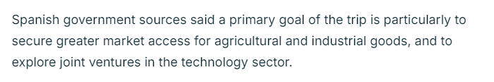 法國24新聞臺的報道認為,桑切斯希望通過此訪將西班牙定位為中國與歐盟27個成員國之間的重要橋梁。報道援引西班牙政府消息人士的話稱,此訪的主要目標是擴大經(jīng)貿合作,尤其是在農產品、工業(yè)品方面,并探索雙方在技術領域的合作。同時,西班牙還將利用此次訪問為歐元區(qū)第四大經(jīng)濟體吸引新的投資。