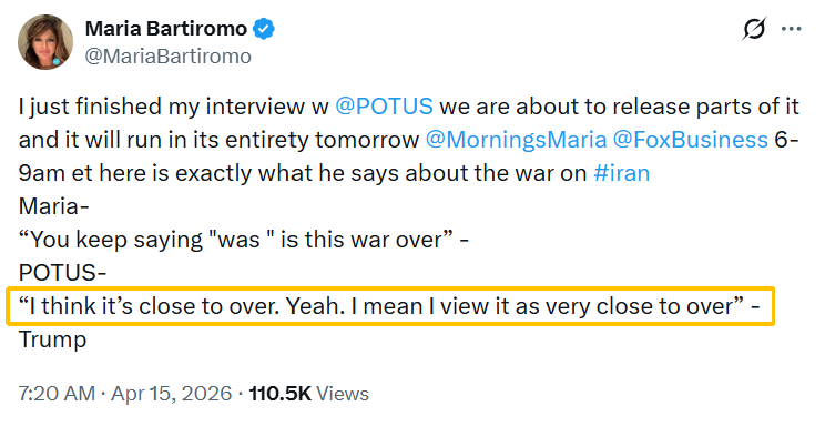 特朗普當(dāng)天接受??怂剐侣?lì)l道記者采訪。記者問(wèn),為什么“你一直在說(shuō)‘戰(zhàn)爭(zhēng)結(jié)束了’”。特朗普回答說(shuō):“我覺(jué)得(伊朗戰(zhàn)事)已經(jīng)接近結(jié)束了。是的,我是說(shuō),我認(rèn)為已經(jīng)非常接近結(jié)束了?!?/p>