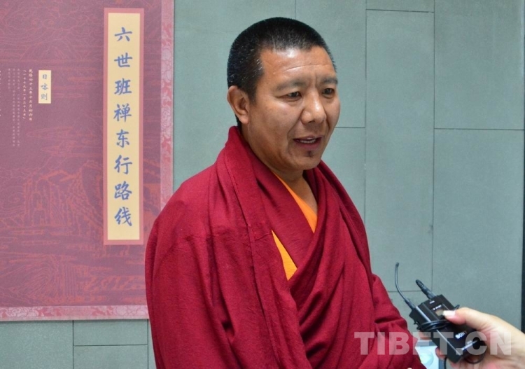 圖為扎什倫布寺管委會副主任多布瓊在展覽現(xiàn)場接受專訪 攝影:歐帆